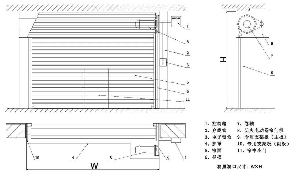 3.鋼制防火卷簾電動啟、閉的運行速度應(yīng)為2m/min~7.5m/min,其自重下降速度不應(yīng)大于9.5m/min。