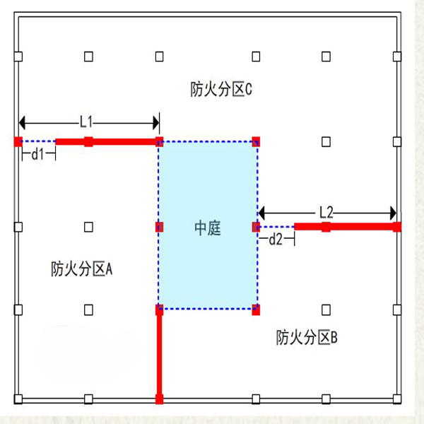 如上圖所示:防火分區(qū)C與防火分區(qū)B之間的分隔部位僅為L2,中庭部位不計(jì)算在內(nèi)。則防火卷簾d2,當(dāng)L2≤30m時(shí), d2≦10m;當(dāng)L2>30m時(shí), d2≦1/3L2,,且不應(yīng)大于 20m