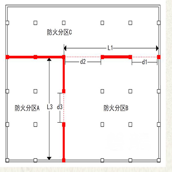 如上圖所示,防火分區(qū)B與防火分區(qū)A和防火分區(qū)C均相鄰。但是防火分區(qū)B與防火分區(qū)C和防火分區(qū)A的分隔部位寬度分別為L1和L3,不應(yīng)相加計(jì)算。其防火卷簾寬度需要分別在相鄰兩個(gè)防火分區(qū)處滿足規(guī)范要求。例如在L1處時(shí),防火卷簾寬度為d2+d1,相對L1滿足規(guī)范要求。