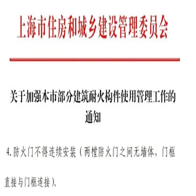 3.《耐火構(gòu)件通知》四:4.防火門(mén)不得連續(xù)安裝(兩樘防火門(mén)之間無(wú)墻體,門(mén)框直接與門(mén)框連接)
