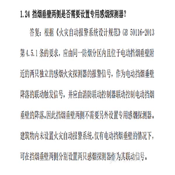 答復:根據《火災自動報警系統設計規(guī)范》GB 50116-2013第 4.5.1 條的要求,應由同一防煙分區(qū)內且位于電動擋煙垂壁附近的兩只獨立的感煙火災探測器的報警信號,作為電動擋煙垂壁降落的聯動觸發(fā)信號,并應由消防聯動控制器聯動控制電動擋煙垂壁的降落。因此擋煙垂壁兩側不需要另外設置專用感煙探測器。建筑物內未設置火災自動報警系統,僅有電動擋煙垂壁的情況下,可在擋煙垂壁兩側分別設置兩只感煙探測器作為其聯動信號。